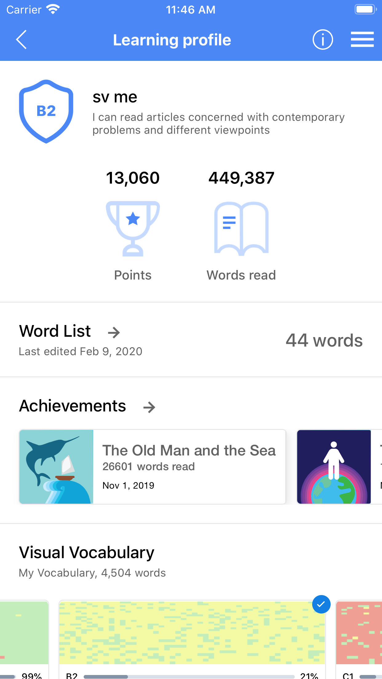 Monitor your progress and learned vocabulary through the visual Vocabulary.